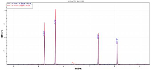 样本加标TIC图(红色)与邻苯混标TIC图(粉色)