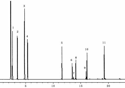 1. 苯 2.甲苯 3.间二甲苯 4.邻二甲苯 5.正十四烷 6.甲苯二异氰酸酯(I)7. 甲苯二异氰酸酯(II)9.己二异氰酸酯 10.异佛尔酮二异氰酸酯(I)11. 异佛尔酮二异氰酸酯(II) 12.二苯甲烷气体二异氰酸酯