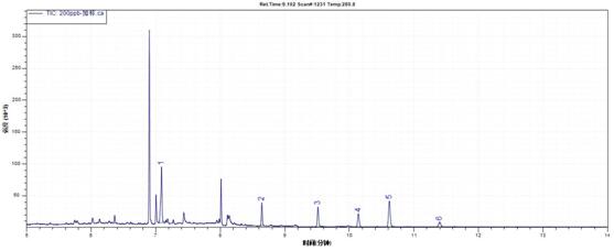 测定体例:TIC(FULL SCAN)定性(扫描规模:45-450amu),SIM形式定量。
