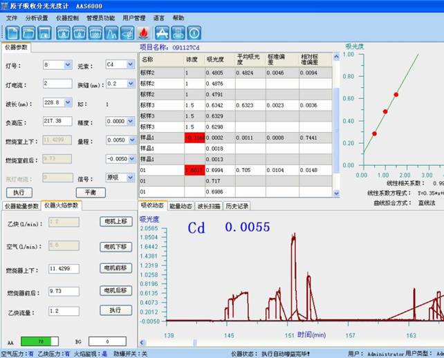 于共价键收到光谱图仪 228.8 nm 处,调控文化氛围-乙炔贫燃烈焰,以水调零,测量试液的吸光度,减去伴同试料的空白试试盐溶液的吸光度,从任务卡曲线上线下验出初始化失败的镉溶度。
