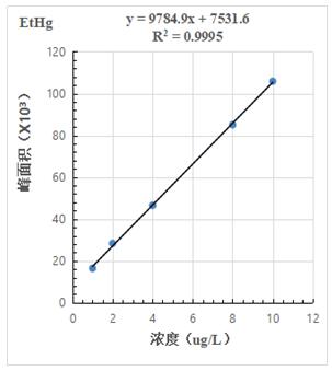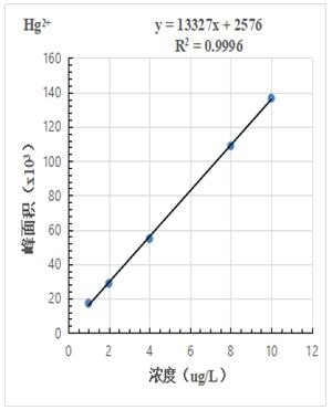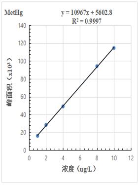 六种汞标准水液体接收淋洗液依据系数浓硫酸浓度的体例顺次被浓缩咖啡为1.0µg/L、2.0.µg/L、4.0µg/L、8.0µg/L、10.0µg/L 夹杂着标准水液体,直接调制5µg/L六种汞外形的单标水液体,也可以甄别每一种的汞外形的出峰情况。