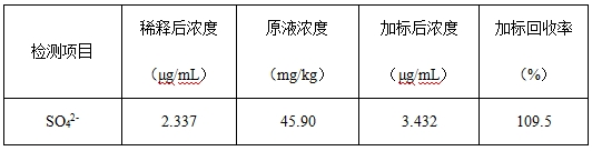 根据硫酸根各浓度点顺次进样,计较其峰面积,以浓度和峰面积绘制规范曲线,线性相干系数为0.99996,成果详见图1。