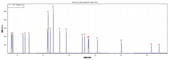 测定体例:TIC(FULL SCAN)定性(扫描规模:45-300amu),SIM形式定量。