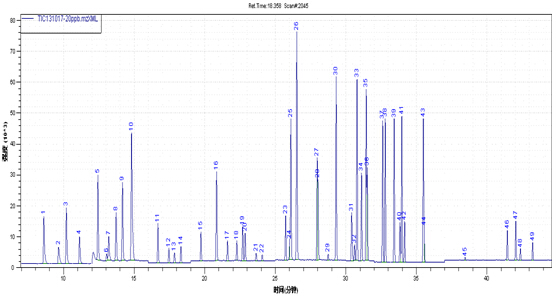 图2. 54种挥(hui)发性无机物(wu)(VOCs)规范♊物(wu)资在SIꦬM形式下的TIC图