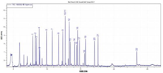 1—α-六(liu)(liu)六(liu)(liu)六(liu)(liu);2—β-六(liu)(liu)六(liu)(liu)六(liu)(liu);3—γ -六(liu)(liu)六(liu)(liu)༒六(liu)(liu);4—蒽-D10(内标);5—δ-六(liu)(liu)六(liu)(liu)六(liu)(liu);6—七氯;7—艾(ai)氏剂(ji)(ji);8—环氧(yang)七氯 B;9—γ-氯丹(dan);;10—硫(l𓃲iu)丹(dan) I;11—α-氯丹(dan);12—4,4'-DDE;13—狄氏剂(ji)(ji); 14—异(yi)狄氏剂(ji)(ji);15—硫(liu)丹(dan) II;16—4,4'- DDD; 17—异(yi)狄氏醛(quan);18—硫(liu)丹(dan)硫(liu)酸酯;19— 4,4'-DDT;20—异(yi)狄氏酮; 21—甲氧(yang) DDT;22—苝-D12(采样替换物)