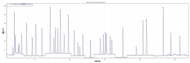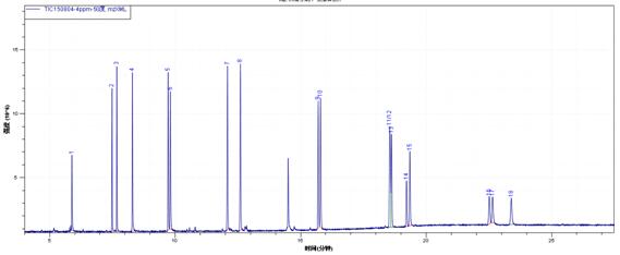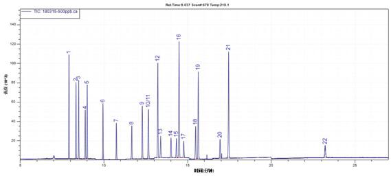 1. α-六六六;2. β-六六六;3. γ-六六六;4. 蒽-D10(内标);5. δ-六六六;6. 七氯;7. 艾氏剂;8. 环氧七氯B;9. γ-氯丹;10. 硫丹I;11. α-氯丹;12. 4,4'-DDE;13. 狄氏剂; 14. 异狄氏剂;15. 硫丹 II;16. 4,4'- DDD; 17. 异狄氏醛;18. 硫丹硫酸酯;19. 4,4'-DDT;20. 异狄氏酮; 21. 甲氧DDT;22. 苝-D12(替换物);