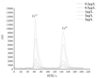 顺次进样测试0.2 µg/L、0.5 µg/L、1 µg/L、3 µg/L、5 µg/L Cr3+和Cr6+夹(jia)杂规范溶(rong)液(ye),分手度(d🍌u)R>1.5,完(wan)整分手。