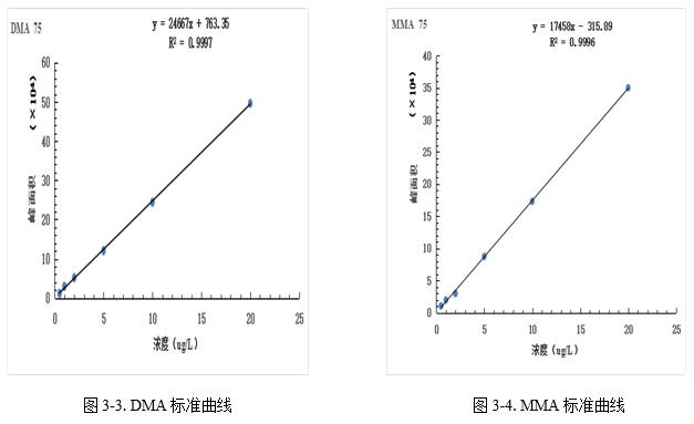 根据夹杂规范溶液浓度0.5µg/L、1.0µg/L、2.0µg/L、5.0µg/L、10.0µg/L、20.0µg/L进样获得色谱图,计较其峰面积,以浓度和峰面积绘制规范曲线,线性相干系数均大于0.999,成果详见图3-1~3-5。