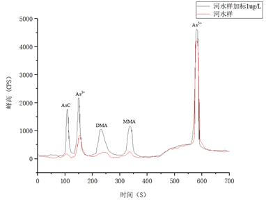 江水样本及加标1µg/L的测式收获具体情况见表4,样本及加标后砷的形状累加谱图所显示5所显示。
