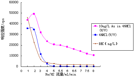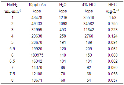 仪器起首在规范形式下停止参数优化(操纵10𝓀μg·L-1的Li、Co、In、U、Ce调谐液对仪器任务参数停止调理,使仪器活络度高,同时氧化物及双电荷产率小于3%);再开启He/H2碰撞反映气,慢慢增大He/H2流量,测试超纯水、4%HCl及10ꩵμg·L-1 As(4%HCl介质)在75amu处的呼应旌旗灯号,计较其背景等效浓度(具体数据见表1及图1);并操纵As标液进一步优化He/H2流量,获得仪器任务参数如表2所示。