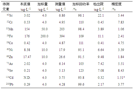 在仪器优化任务ඣ参数前提下,对样品溶液及加标样液停止测试,计较其加标收受接管率;对样品空缺溶液平行测定7次,以三倍空缺旌旗灯号规范误差/活络度对应的浓度为检出限;同时对样品溶液平行测定11次(距离2min),计较其绝对规范误差,考查精密🎀度,数据见表4。各元素检出限在0.41-22.07ng/L之间,加标收受接管率在93.82%-123.10%之间,精密度在1.06%-8.43%之间。